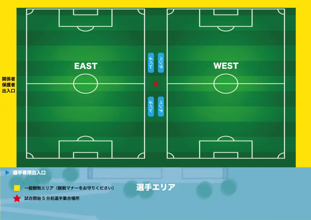 保護者・指導者の応援場所は黄色で塗り潰したエリアです。フィールド内、子どもエリアへの立ち入りは原則不可となっています。