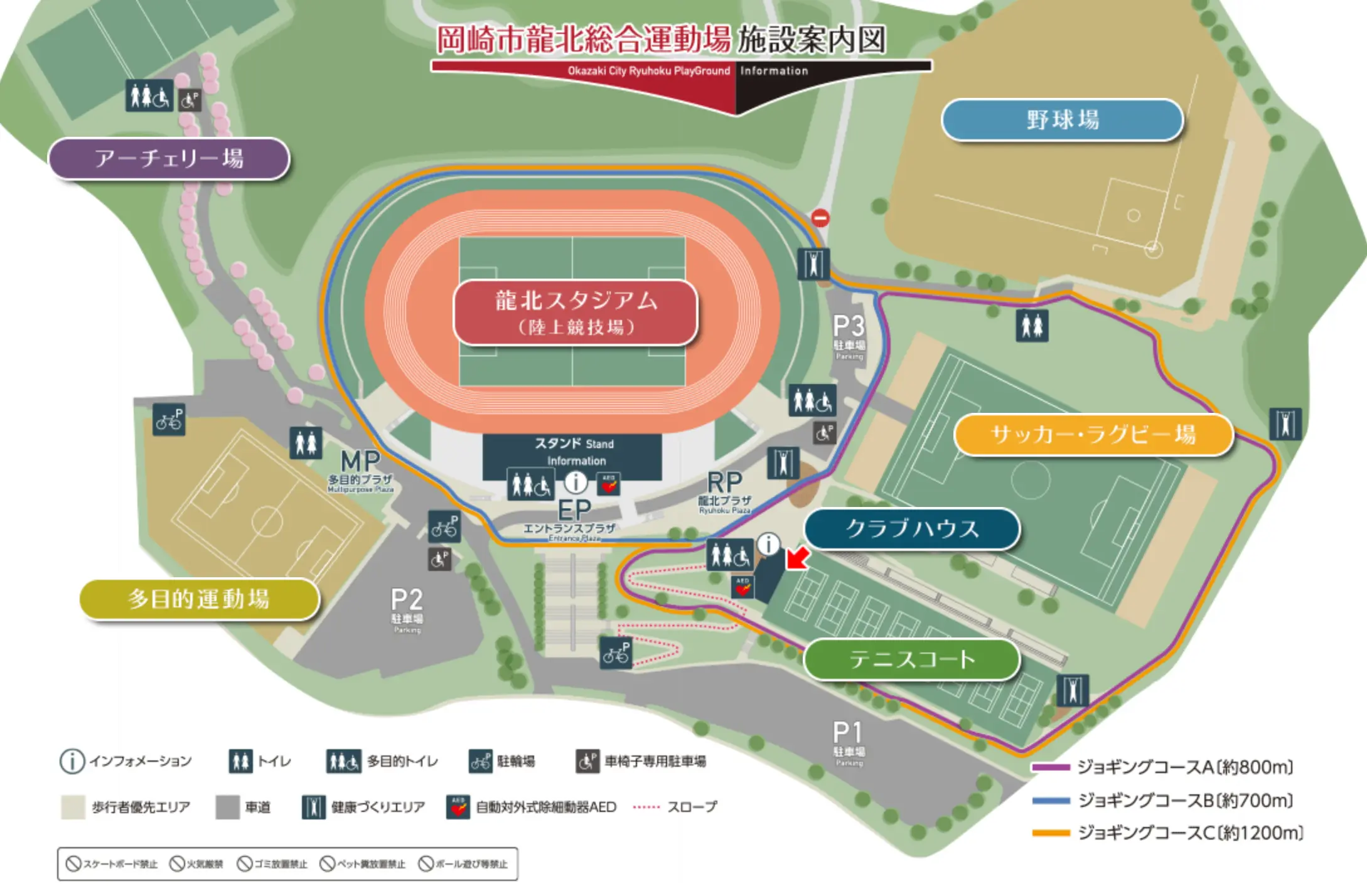 駐車場はP1またはP2をご利用ください。グラウンド横のP3駐車場は数に限りがあります。