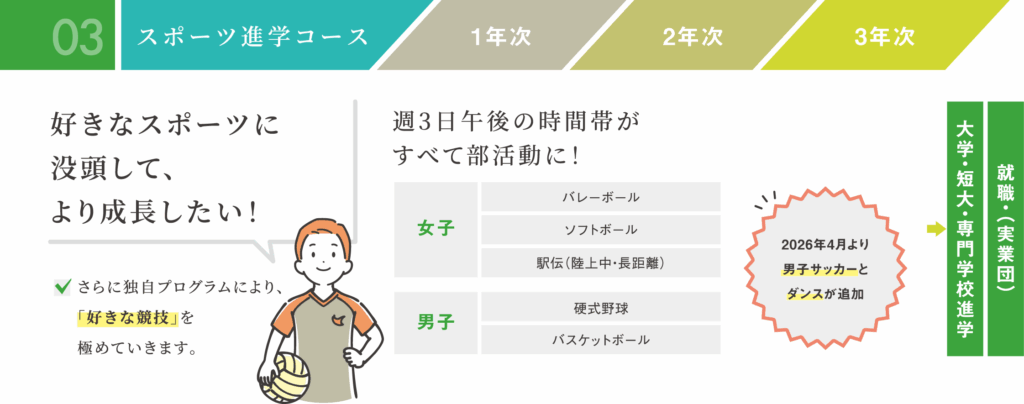 人環大岡崎高校には3つのコースがあります。特進コース、進学コース、そしてスポーツ進学コースです。2026年春に創立する人環大岡崎高校サッカー部はスポーツ進学コースです。